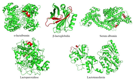 The potential binding regions were inferred by peptide abundance changes calculated via proteomics data and were mapped onto WPI sequences. Software tools such as Pymol can be used to map MS data to the protein structure to achieve data visualization [55]. The potential binding regions are shown as 3D structures in Figure 7. As shown in Figure 7, the peptide fragment “VGINYWLAHK” was probably a binding region between FVPs and alpha-lactalbumin; the peptide fragment “TKIPAVFKIDALNENK” or “IDALNENKVLVLDTDYKK” was likely docked with β-lactoglobulin. The peptides TPVSEKVTK and DAFLGSFLYEYSR were the binding region of serum albumin to FVPs. FVPs interacted with lactoperoxidase through binding with peptide LFQPTHK and DGGIDPLVR, and the peptide fragments “KANEGLTWNSLK” and “APVDAFK” were the binding region of lactotransferrin to FVPs. The previous study showed that the peptide fragment “VGINYWLAHK” was one of the binding regions of alpha-lactalbumin to Tremella fuciformis polysaccharide [41]. Accurate binding region of WPI and polysaccharide would be inferred through a mass of dates in further research. In this study, results about the predictions of binding regions implied that the proteomics is a useful technique that will be further developed for studying the interaction properties between polysaccharide and protein in the future.