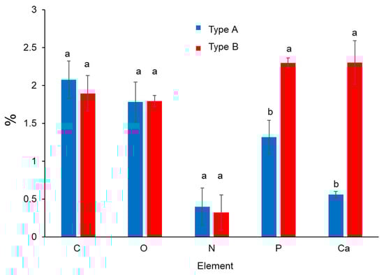 The elements of proteins and minerals were only analyzed in deposits on SSP surface. The main elements comprising proteins, i.e., carbon, oxygen and nitrogen did not show significant difference (p < 0.05) between type A and B deposits, whereas phosphorus and calcium concentration revealed significantly higher content (p < 0.05) of type B deposits (Figure 1), because of more mineral composition (Table 2).
