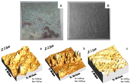 Appearance of SSP with deposits type (A) (panel A), and type (B) (panel B). AFM micrographs of SSP plates: (a) type A deposits; (b) type B deposits; (c) SSP without deposits.