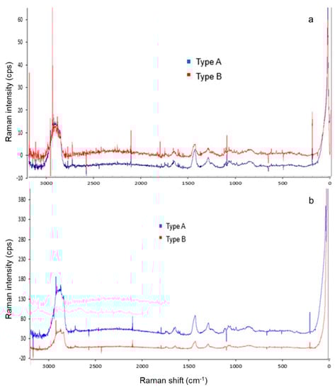 Raman spectra obtained for type A (red line) and type B (blue line) deposits on ELP are shown in Figure 3b. The spectra of both type of deposits on SSP and ELP were similar. However, both types of deposits on ELP showed lower noise that produced more defined peaks, because of lower concentration of organic matter leading to low interference [52].
