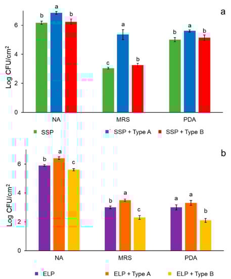 Microbial population recovered from 5-day biofilms formed on the surface of SSP plain and with type A or B deposits (a), and ELP plain and with type A or B deposits (b). NA = nutrient agar, MRS = de Man Rogosa Sharpe agar, PDA = potato dextrose agar.