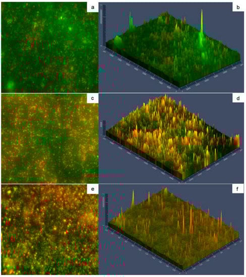 The transition of reversible to irreversible attachment of micro-organisms in biofilms is related to the synthesis of extracellular polymeric substances that not only help in the attachment process but also protect the cells from environmental fluctuations [53,54] This leads to the formation of microcolonies, which coalesce to form a mature biofilm. The micrographs of biofilms on SSP with type A deposits show more green fluorescence (Figure 5a,b) than type B deposits (Figure 5c,d), indicating higher number of viable cells in the mature biofilm [55]. This can be associated with more surface area and higher protein concentration that can support microbial growth for longer time. In relation to ELP with type A deposits viable cells were visualized as small clusters of scattered damaged cells across the plate surface, suggesting viability loss due to the surrounding environment with depleted nutrients (Figure 5e,f).