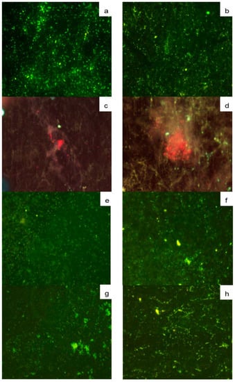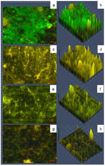 Micrographs of SSP with biofilms on type A deposits. Panels (a,b) show 5-day biofilms. Panels (c,d) show the cleaning stage of 50 mg NaOH/L of AEW at 30 °C for 10 min, only. Panels (e), f show disinfection using 50 mg/L total available chlorine of NEW at 20 °C for 5 min, only. Panel (g,h) show cleaning followed by disinfection stages. Green fluorescence indicates viable cells, while red fluorescence indicates damaged cells. Panels (a,c,e,g) show 40X magnification; panels (b,d,f,h) show fluorescence intensity.