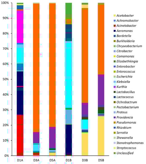 The bacterial diversity of biofilms on type A deposits decreased from days 1 to 5 according to the Shannon–Wiener index, and confirmed by reduction of the Equitability index. Biofilms on days 3 and 5 showed predominance of Pseudomonas genus (Figure 7), and a reduction of diversity as indicated by the J′ values (Table 6). Pseudomonas are commonly found in dairy plants and many isolates can form biofilms [60] as shown here. In particular, biofilms of Pseudomonas aeruginosa of dairy origin have shown multiple resistance to chemical treatment [61]. On the other hand, biofilms on type B deposits showed less biodiversity changes with maturation time. On days 3 and 5 three genera were dominant, being the most abundant Pseudomonas, followed by Streptococcus and Providencia, while equitability remained constant (Table 6, Figure 7). This finding confirms that biofilms comprise mixed bacterial populations, while the most predominant groups are the best adapted to the environmental conditions. There are reports showing the importance of biofilm development during storage and handling of raw milk, the genera involved, and their influence on the quality and safety of final products [62,63].