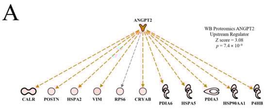 Examples of functional networks in Table 2 are presented in Figure 2. In the vasculogenesis function network (Figure 2A), all up-regulated proteins, with the exception of CALR (calreticulin), contributed to the prediction of activation (activation Z score = 2.43, p = 4.46 × 10−4). The yellow dashed inhibitory line (indicating that the relationships of up-regulation of CALR and predicted activation of vasculogenesis are inconsistent with literature citations) for CALR indicates that enhanced vasculogenesis is typically associated with down-regulation of CALR. The down-regulation of ACP1 would contribute to the predicted activation of vasculogenesis because it would reduce the inhibitory effect on this function. On the other hand, the effects of PKM and LDHA were inconsistent with their down-regulation, indicating that increased expression of these proteins would normally be associated with increased vasculogenesis.