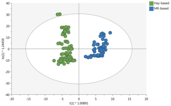 As can be observed, the metabolomic dataset was able to explain 37.1% of the total variability when considering the two principal components (i.e., PC1 and PC2). Additionally, the score plot revealed that the chemical profile of milk was very similar between the two different sample groups (i.e., hay vs. hay/fresh forage), although a separation trend between the two feeding systems could be highlighted (Figure 1). Therefore, although no distinct information about the specific composition of each diet, untargeted metabolomics demonstrated a fairly good ability to discriminate the chemical fingerprint provided by the fresh forage, thus justifying the further application of a supervised statistical approach to find possible discriminant and marker compounds. Then, the supervised orthogonal projection to latent structures discriminant analysis (OPLS-DA) was produced to inspect and then evaluate the contribution of each milk metabolite for discrimination purposes. OPLS-DA has been successfully used in previous works, based on cheese traceability and when considering the impact of cows’ feeding on the chemical profile of milk intended for processing into cheese [7,12]. Accordingly, by introducing an orthogonal signal correction, this supervised method removes the variation not directly correlated with Y in the X matrix, thus considering only the Y-predictive variation. Furthermore, the method maximizes the covariance existing between the measured data (i.e., MS-peak intensities) and the response variable (i.e., predictive classification based on the feeding system). The OPLS-DA score plot, built considering the feeding system as a class-discriminant parameter, is provided as Figure 2.
