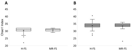 α-diversity plots calculated with the Chao1 index at the genus (A) and family (B) level.