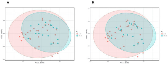 β-diversity plots calculated with PCoA distance matrix and Bray–Curtis index at the family (A) and genus (B) level.