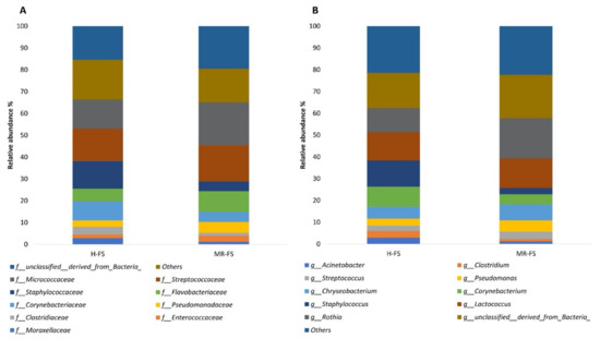 Thereafter, taxonomic classification was carried out at both family and gender levels. At the family level (Figure 5), evaluation of the relative abundance of the highest top 10 OTUs revealed that the populations of Corynebacteriaceae and Staphylococcaceae were, on average, 8% and 4% higher in H-FS samples than in MR-FS samples.