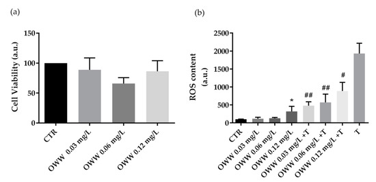 An increase in systemic oxidative stress related to abnormal production of ROS is often associated with aging and several diseases including hypertension, obesity, and cancer. A growing number of bioactive phytocompounds, known for their beneficial and antioxidant actions on human health, are more frequently recommended as therapeutic adjuvants in several diseases [25]. Here, we evaluated the effects of extracts obtained from olive by-products and wastes on cell viability in human colorectal carcinoma HCT8 cells. Furthermore, the potential antioxidant efficacy of olive by-products and wastes was assayed as well. Cells were incubated overnight with extracts derived from OWW at increasing concentrations (0.03 mg·L−1, 0.06 mg·L−1, and 0.12 mg·L−1 of phenols). Compared to cells left under control conditions, treatment with OWW extracts does not alter cell viability at the concentration used (Figure 1a). Under similar conditions, ROS content was measured in HCT8 cells. Compared to untreated cells (CTR), ROS production increased in cells incubated with OWW extracts at 0.12 mg·L−1 (Figure 1b). Indeed, compared to the positive control (tBHP), cells co-incubated with the oxidant tBHP, and OWW extracts showed a significant decrease in ROS generation induced by tBHP (Figure 1b).