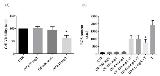 Next, HCT8 cells were treated with extracts obtained from OP at increasing concentrations (0.03 mg·L−1, 0.06 mg·L−1 and 0.12 mg·L−1 of phenols). Compared to CTR cells, treatment with OP extracts at 0.12 mg·L−1 of phenols displayed a cytotoxic effect (Figure 2a). Fluorimetric measurements revealed that cells co-incubated with the oxidant tBHP and OP extracts at 0.12 mg·L−1 of phenols showed a significant decrease in ROS generation induced by tBHP. However, a relevant but not significant reduction in ROS content was measured in cells co-treated with tBHP and OP extracts at 0.03 mg·L−1 and 0.06 mg·L−1 of phenols. Incubation with the OP extracts alone, at increasing concentrations (0.03 mg·L−1, 0.06 mg·L−1, and 0.12 mg·L−1 of phenols) does not alter ROS production.