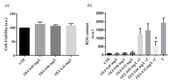 Similar evaluations were performed in cells treated with OLE. Specifically, compared to CTR, treatment with OLE does not alter cell viability at the used concentrations (Figure 3a). Moreover, compared to the positive control (tBHP), HCT8 cells co-incubated with tBHP and OLE at 0.12 mg·L−1 of phenols displayed a significant reduction in ROS content. Incubation with the OLE alone, at increasing concentrations (0.03 mg·L−1, 0.06 mg·L−1, and 0.12 mg·L−1 of phenols) does not alter ROS content (Figure 3b).