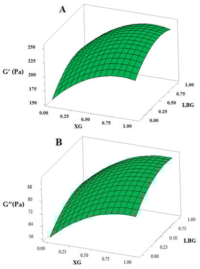 Response surface showing the effect of xanthan gum (XG) and locust bean gum (LBG) on linear viscoelastic properties (G’ and G”) of the dough.
