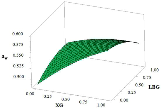 Response surface showing the effect of xanthan gum (XG) and locust bean gum (LBG) on the water activity (aw) of biscuits.