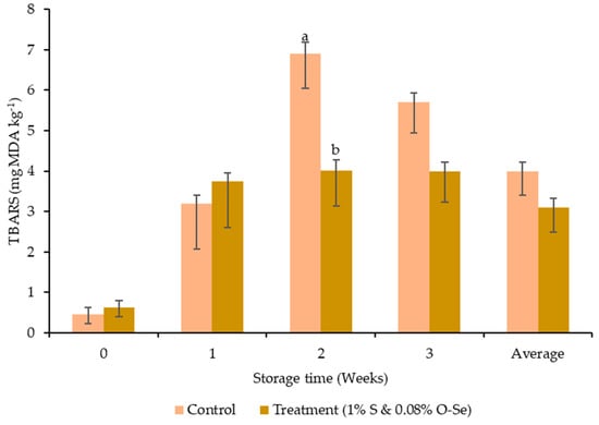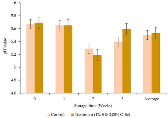 The pH in both treatments decreased gradually up to the second week of storage, with a subsequent increase at the end of the third week. On the other hand, no significant difference was observed between the control and S- and O-Se-added diet (Figure 1). The addition of S and O-Se resulted in significantly lower TBARS values during second week of storage (p < 0.05) (Figure 2).