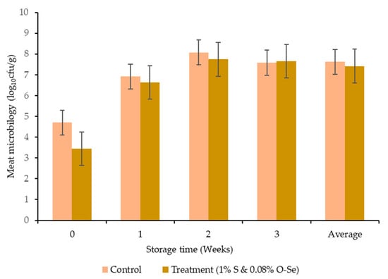 The average meat microbial content was numerically lower, but not significant (7.62 vs. 7.41 log10 CFU) in the S- and O-Se-supplemented diet compared to the control treatment after the 3-week refrigerated storage period (Figure 3).