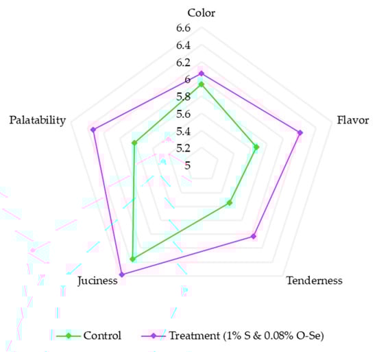Although no significant impact (p > 0.05) was observed for color, flavor, tenderness, juiciness, and palatability, the S- and O-Se-supplemented diet had a positive tendency on the sensory parameters (Figure 4).