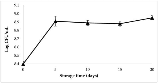 Viability of L. plantarum WCFS1 in SOFB was evaluated for 20 days of storage at 4 °C (Figure 3). The viable counts of L. plantarum WFCS1 in SOFB increased 0.5 Log CFU/mL over the first 5 days of refrigerated storage and no further significant (p ≤ 0.05) enhancements were observed from 5 to 15 storage days. L. plantarum WFCS1 exhibited good stability over 20 days of refrigerated storage. These results demonstrate that the viability of the starter culture was not compromised and it was able to maintain its metabolic activity during the storage period. These findings are in agreement with results reported by Amanda and Choo [60] and Mesquita et al. [61], who observed a notable growth of L. plantarum and L. paracasei LBC 81 in watermelon juice and chickpea-coconut fermented beverages, respectively, during refrigerated storage for 10–14 days. Contrarily, several studies have reported the decrease of various lactobacilli species used as starters in different vegetable fermented beverages throughout the storage period [54,62]. According to the definition of the World Health Organization, probiotics are living microorganisms that when they are administered in adequate amounts confer a health benefit on the host [63]. Recommended properties for probiotic microorganism include survival in the gut, persistence in human gastro-intestinal tract, adherence to human epithelial cells, and proven safety for human consumption [37]. When administered in appropriate amounts, probiotic bacteria provide health benefits such as maintenance of a good microbiota composition, resistance against gastrointestinal infection by pathogens and also exhibit immunomodulatory effects [64]. The probiotic properties of L. plantarum WCFS1 in vitro and in vivo have been well documented [64]. Even though there is no general consensus on the recommended probiotic levels to confer beneficial health effects in the host, it has been suggested that the probiotic viability must be maintained at 106–108 CFU/mL until the food expiry date [65]. The counts of viable L. plantarum WCFS1 cells at the end of the storage period agree with this criterion, suggesting that SOFB can be considered a probiotic beverage.