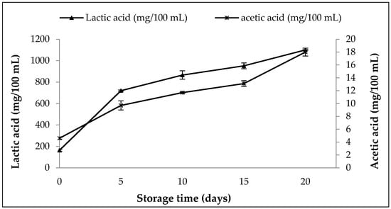 Figure 4 illustrates the variations in the content of organic acids in SOFB during refrigerated storage. Both lactic and acetic acids increased steadily throughout the storage period, reaching values of 1100 mg/100 mL and 18 mg/100 mL for lactic and acetic acid, respectively, at the end of the storage period. It can be clearly observed that the production of both organic acids was more pronounced during the first 5 storage days, which is in accordance with the strong increase in L. plantarum WCFS1 viable cells observed during this period (Figure 3). The post-acidification of SOFB is the result of the fermentation of carbohydrates by the starter culture and indicates the active metabolic activity of L. plantarum WCFS1 at low temperatures. This phenomenon has been previously observed in soy-based fermented beverages produced with probiotic LAB [54].