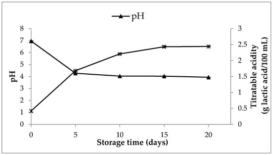 Variations in pH and titratable acidity of SOFB during storage at 4 °C for 20 days.