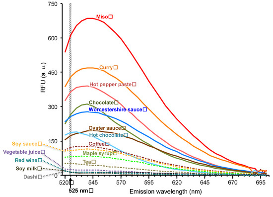 Ca2+ imaging using fluorescence dyes is one of the major methods employed for measuring the activation of TRP channels [27,28,29]. At the beginning of this study, we examined the fluorescence spectra of 15 foods (miso, curry, hot pepper paste, chocolate, Worcestershire sauce, oyster sauce, hot chocolate, coffee, soy sauce, maple syrup, tea, vegetable juice, red wine, soy milk, and dashi) under the wavelength used for the representative Ca2+-sensitive fluorescence probe Fluo-8 (excitation wavelength: 490 nm) (Figure 1). Ten of the foods elicited strong fluorescence at the wavelength used for the fluorescence probes (Ex, 490 nm; Em, 525 nm). Miso, curry, hot pepper paste, chocolate, and Worcestershire sauce showed particularly strong fluorescence. Miso, curry, hot pepper paste, Worcestershire sauce, and soy sauce are reported to contain Maillard reaction products [30,31,32,33,34,35]. As Maillard reaction products are known to exhibit fluorescence [14,15], melanoidin, which is a brown pigment, generated during the Maillard reaction is the likely source of the fluorescence in these foods. Fluorescence by polyphenols has also been reported [36]. Since chocolate and hot chocolate contain Maillard reaction products and polyphenols [33,37], these compounds are thought to be responsible for the observed fluorescence. Because multiple food components emit strong fluorescence, evaluating hTRPV1 activity using the fluorescence method in the presence of these components would be difficult, prompting our development of a luminescence-based assay system that does not use fluorescent probes.