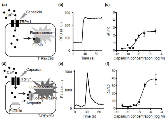 Comparison of measured human transient receptor vanilloid 1 (hTRPV1) activity for fluorescence- and luminescence-based assays. (a,d) Mechanism underlying the cell-based hTRPV1 assay system for the fluorescence (a) and luminescence (d) methods. Increased intracellular Ca2+ concentration induced by hTRPV1 activation is detected as fluorescent or luminescent signals. (b,e) Representative Ca2+ responses elicited by 10 nM capsaicin in the fluorescence (b) and luminescence (e) assays. (c,f) Concentration–response curves for capsaicin on hTRPV1 obtained in the fluorescence (c) and luminescence (f) methods. Data are presented as the average (n = 3) ± SE (error bars) in (c,f).