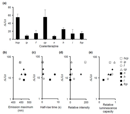 Comparison of the hTRPV1 activity of eight types of coelenterazines with different luminescence properties. (a) hTRPV1 activity induced by 10 µM capsaicin for each luminescent substrate. Data are presented as the average (n = 3) ± SE (error bars) (b–e). Correlation between hTRPV1 activity and four luminescence characteristics of coelenterazines. Emission maximum, the maximum emission wavelength; half-rise time, time required for the luminescent signal to reach 50% of the maximum after the addition of 1 mM Ca2+; relative intensity, the degree of Ca2+ sensitivity relative to that of native aequorin (1.0); and relative luminescence capacity, total time-integrated emission of aequorin in saturating Ca2+ relative to that of native aequorin (1.0) [39,40]. Each symbol represents different kinds of coelenterazine (hcp, ip, f, cp, n, h, i, and fcp). Opened square: hcp; opened diamond: ip; opened circle: f; opened triangle: cp; closed square: n; closed diamond: h; closed circle: i; and closed triangle: fcp.