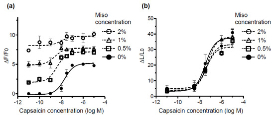 Various foods elicited strong fluorescence at the wavelength used in the fluorescence method (Figure 1). We investigated whether the fluorescence and luminescence assays can accurately detect hTRPV1 activity in samples containing fluorescent substances. Miso, which is a popular seasoning in Asia, was used as a model food because it emits strong fluorescence (Figure 1). hTRPV1 activation by capsaicin was measured using the fluorescence and luminescence method in the presence of 0, 0.5, 1, and 2% of miso, and the resulting concentration–response curves were compared. As higher concentrations of miso resulted in a higher background, the fluorescence assay could not assess dose-dependent hTRPV1 activation by capsaicin in the presence of ≥1% miso (Figure 4a). In contrast, the luminescence assay effectively demonstrated capsaicin concentration-dependent activation of hTRPV1, showing that this method was barely affected by 0.5–2% miso (Figure 4b). The result also showed that the miso did not activate hTRPV1. Therefore, the luminescence assay detects hTRPV1 activity, even in the presence of fluorescent substances. Miso soup contains about 10% miso. We observed that 1% miso disrupted the hTRPV1 fluorescence assay, representing a concentration one-tenth that of ordinary miso soup. Accordingly, the luminescence assay would be useful for assessing samples that contain a fluorescent ingredient such as miso.