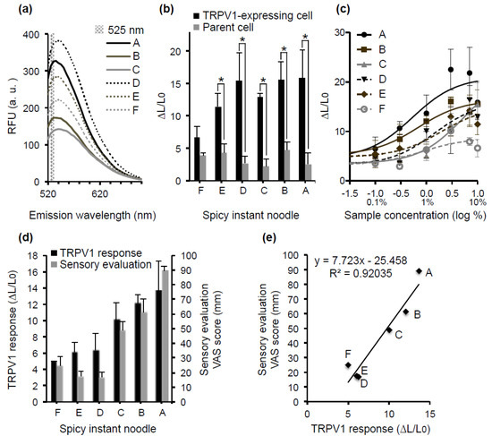 hTRPV1 activity and pungency intensity of spicy instant noodles. (a) Six types of spicy instant noodles (designated A–F) were tested. Fluorescence spectra of six kinds of the noodle broths when they were irradiated with fluorescent light (490 nm). The gray range shows the emission wavelength (525 nm) that is used for the fluorescence-based hTRPV1 assay. (b) Ca2+ responses elicited by 10% noodle broth on the hTRPV1-expressing cells (black) and parent cells not expressing hTRPV1 (gray). Data are presented as the average (n = 3) ± SE (error bars); * p < 0.05 (unpaired t-test). (c) Concentration–response curves for hTRPV1 activity induced by noodle broths using the luminescence assay. Data are presented as the average (n = 3) ± SE (error bars). (d) Correlation between hTRPV1 activity in the luminescence assay (black) and pungency intensity in the sensory test (gray) for 1% and 10% noodle broth, respectively. Data are presented as the average (hTRPV1 assay, n = 3; sensory evaluation, n = 12) ± SE (error bars). (e) Correlation analysis of hTRPV1 activity and the pungency intensity of six noodle broths.