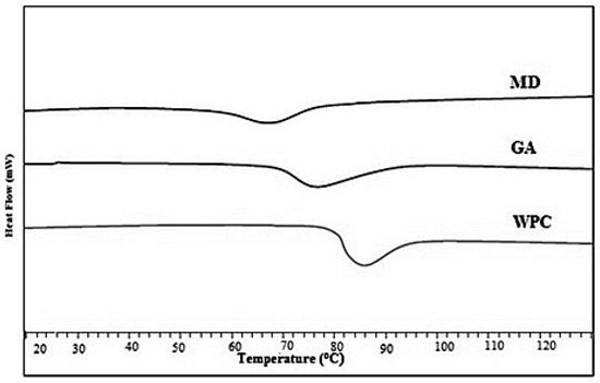 Various studies have shown that surface stickiness of an amorphous powder is closely linked with glass transition temperature. The Tg value of liquid honey is very low (42.95 °C) due to the presence of simple sugars (of lower molecular weight), including glucose and fructose, and, thus, plasticization effect of water results in the stickiness of honey during spray drying. The Tg values of the fortified powders with MD, GA, and WPC ranged significantly (p < 0.05), and were 68.26 °C, 74.53 °C, and 86.13 °C, respectively (Figure 1).
