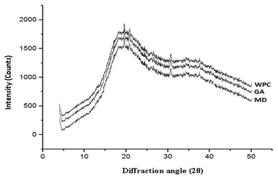 XRD determines the crystalline or amorphous state of dried powders. Usually, several sharp peaks are present in highly-ordered state in a crystalline material while disordered and dispersed bands are displayed in the molecules of amorphous products [14]. In the current study, the diffractograms of the fortified powders with WPC, GA, and MD showed amorphous characteristics due to the short contact time during spray-drying (Figure 2).