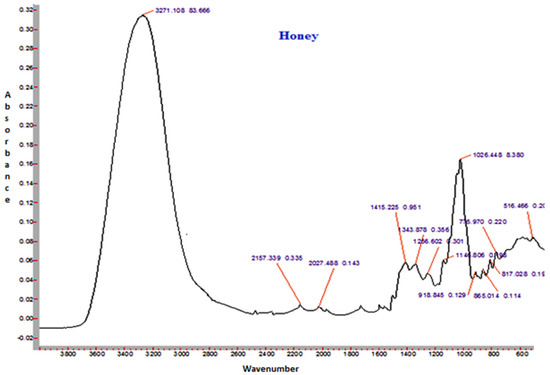 The FTIR spectrum of honey powder samples was obtained with the use of Agilent Cary 660 FTIR spectrophotometer (Agilent Technologies, CA, USA) following the scanning range of 4000–400 cm−1 in transmittance mode at ambient conditions.