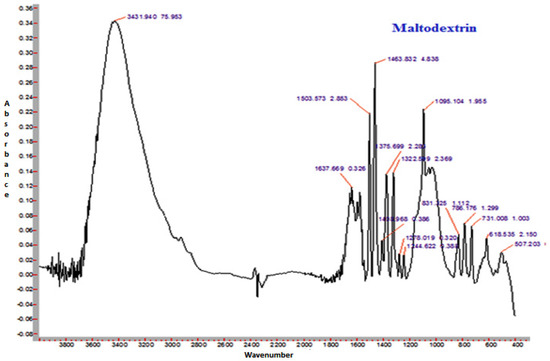 Figure 4. Representative FTIR spectrum of spray-dried nutritionally rich honey powder fortified with maltodextrin (MD).