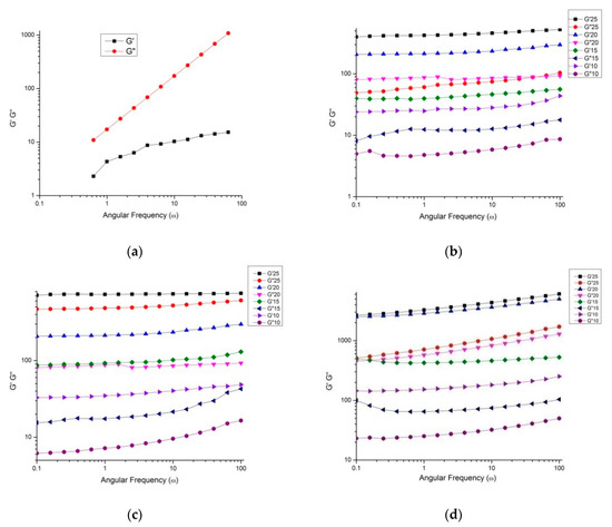 The dynamic frequency sweep rheogram of loss or viscous (G″) and storage or elastic modulus (G′) is shown in the context of angular frequency (1 to 100 rad/s) for sunflower honey and honey powders at different concentrations (10%, 15%, 20%, and 25%) at 20 °C (Figure 7a–d).