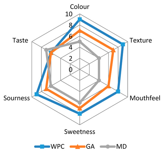 Figure 9. Sensory evaluation of spray-dried nutritionally rich honey powders fortified with maltodextrin (MD), gum arabic (GA), and whey protein concentrate (WPC) carrier agents.