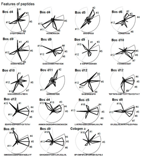 The assessment was made by comparing the area under the graph prepared for 16 variables described by numerical values obtained thanks to the measurements using the algorithm SVM-score using threshold 0.2 and nine amino acids sequences analysis criterion (Figure 2). Based on this, proceeding peptides like NNKIWCKDDQNPHSSNIC-NISCDK (Bos d4), ENSAEPEQS (Bos d5), EAESISSSEEIVPNSVEQK (Bos d9), and GPVGNPGPAGPAGPRGEVGLPGLS (Collagen α1) can be verified in terms of their moderate tolerogenic potential whereas the rest of peptides needs empirical prove of their allergenicity. Basing on integrated model, peptide SSNICNISCDK (Bos d4), SIGSSSEESAEVATEEVK (Bos d10) and TEIPTINTIASGEPTSTPTTEAVESTVAT (Bos d12) may show particularly strong sensitizing properties. Some peptides like GYLEQLLRLKKYKVPQLEIVPNSA, and QKHIQKEDVPSERYLGYLEQLLRL of Bos d9, despite its potential to induce interleukin 10 expression, show a theoretical strong potential to induce allergies.