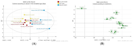 - Nowicka, P.; Wojdyło, A.; Laskowski, P. Principal component analysis (PCA) of physicochemical compounds’ content in different cultivars of peach fruits, including qualification and quantification of sugars and organic acids by HPLC. Eur. Food Res. Technol. 2019, 245, 929–938. [Google Scholar] [CrossRef]