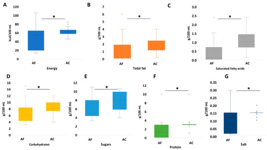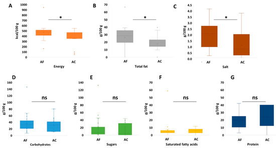 Nutritional profile of snacks formulated with algae (n = 24) vs. algae-free snacks (n = 24). (A): energy (kcal/100 g), (B): total fat (g/100 g), (C): salt (g/100 g), (D): carbohydrate (g/100 g), (E): sugars (g/100 g), (F): saturates (g/100 g), and (G): protein (g/100 g). AF: algae-free and AC: algae-containing; statistical significance based on Kolmogorov–Smirnov test (*: p < 0.05, ns: non-significant (p > 0.05)); the box-plot legend: the box is limited by the lower (Q1 = 25th) and upper (Q3 = 75th) quartile; the median is the horizontal line dividing the box; Whiskers above and below the box indicate the 10th and 90th percentiles; outliers are the points outside the quartile 10–90th percentiles.