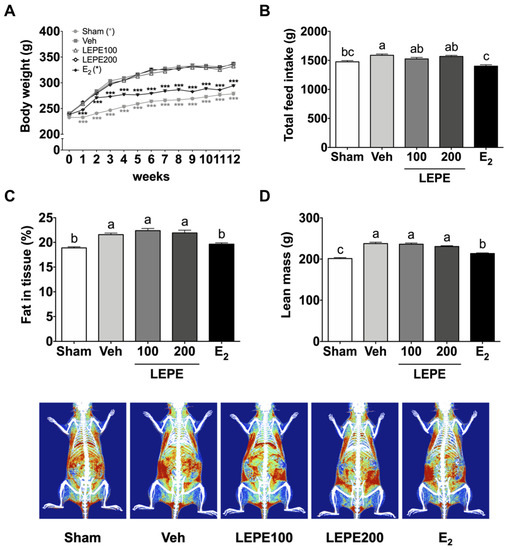Growth performance and body composition in the ovariectomized rat model of menopause supplemented with LEPE. (A) Body weight, (B) total feed intake, (C) whole-body fat in tissue, and (D) lean mass. Sham, control sham-operated rats; Veh, ovariectomized (OVX) rats treated with vehicle; LEPE100, OVX rats treated with Leonurus japonicus Houtt, Eclipta prostrata L., and Pueraria lobata Ohwi extract (LEPE) 100 mg/kg bw; LEPE200, OVX rats treated with LEPE 200 mg/kg bw; E2, positive control, OVX rats injected with estradiol 3.0 µg/kg bw. Data are shown as mean ± SEM (n = 12). a–c Significant differences were analyzed by one-way ANOVA with Tukey’s multiple comparisons between groups (p < 0.05). *** p < 0.001 indicates a significant difference compared to the vehicle group.