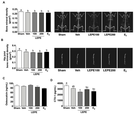The effect of LEPE on menopause-related osteoporosis in body composition and blood. (A) BMD (bone mineral density), (B) hip joint BMD, (C) osteocalcin, and (D) CTX-1 (C-terminal telopeptide of type 1 collagen). Sham, control sham-operated rats; Veh, ovariectomized (OVX) rats treated with vehicle; LEPE100, OVX rats treated with Leonurus japonicus Houtt, Eclipta prostrata L., and Pueraria lobata Ohwi extract (LEPE) 100 mg/kg bw; LEPE200, OVX rats treated with LEPE 200 mg/kg bw; E2, positive control, OVX rats injected with estradiol 3.0 µg/kg bw. Data are shown as mean ± SEM (n = 12). a–c Significant differences were analyzed by one-way ANOVA with Tukey’s multiple comparisons between groups (p < 0.05).