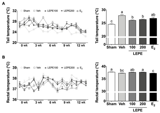 The rectal temperature is presented as an average of six results from nine to twelve weeks. The rectal temperature of the sham was 37.7 °C and that of the vehicle was 37.3 °C, which showed a decrease of 0.4 °C (p < 0.001). In the preceding study, the increase in core temperature indicated a decrease in the surface temperature of the skin. The core temperature decreased when the surface temperature increased and vice versa [54]. LEPE200 increased a rectal temperature by 0.39 °C compared to the vehicle (p < 0.05). These findings are novel, as no previous study has demonstrated temperature improvement using LEPE, either individually or combined. Taken together, these findings indicate that vasomotor symptoms, such as hot flashes, could be improved by LEPE supplementation.