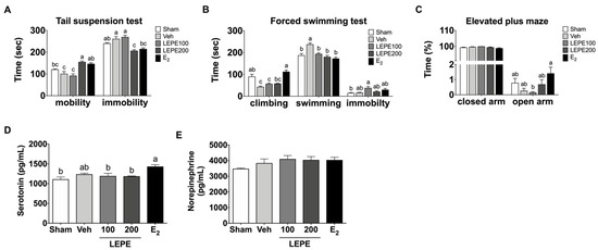 The effect of LEPE on improving menopause-related depression based on behavioral tests and blood hormone levels. (A) Time of mobility and immobility in the tail suspension test, (B) time spent climbing, swimming, and immobility in the forced swimming test, (C) time spent in the closed and open arms in the elevated plus-maze (D) serotonin and (E) norepinephrine levels in the serum. Sham, control sham-operated rats; Veh, ovariectomized (OVX) rats treated with vehicle; LEPE100, OVX rats treated with Leonurus japonicus Houtt, Eclipta prostrata L., and Pueraria lobata Ohwi extract (LEPE) 100 mg/kg bw; LEPE200, OVX rats treated with LEPE 200 mg/kg bw; E2, positive control, OVX rats injected with estradiol 3.0 µg/kg bw. Data are shown as mean ± SEM (n = 12). a–c Significant differences were analyzed by one-way ANOVA with Tukey’s multiple comparisons between groups (p < 0.05).