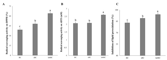 Antioxidant activity of the black chickpea doughs. (A) Radical scavenging activity on DPPH radical; (B) radical cation ABTS scavenging activity and (C) inhibition of the lipid peroxidation (8 days of incubation at room temperature). BC, not inoculated and not fermented; sBC, spontaneously fermented for 24 h at 30 °C; labBC, inoculated with L. plantarum T0A10, and fermented for 24 h at 30 °C. a–c Values with different superscript letters differ significantly (p < 0.05).