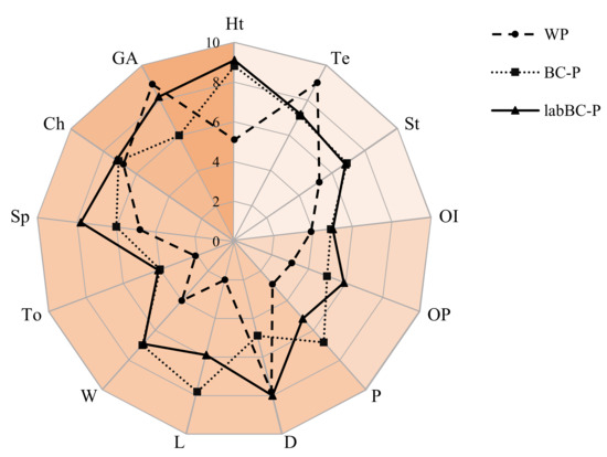 The sensory profile of the experimental pasta was analyzed by a trained sensory panel (n = 13, aged 21–45 years), following the ethical guidelines approved for the sensory laboratory. A written informed consent was signed by all the participants. Twelve sensory attributes (described in Supplementary Table S2) were included in the lexicon [9]. Evaluation was carried out using a line scale from “not at all” (0) to “very” (10). Samples were analyzed after cooking at corresponding OCT and randomized distributed to the panelists, in duplicate. Between the analysis of the pasta samples, water was served to rinse the mouth.
