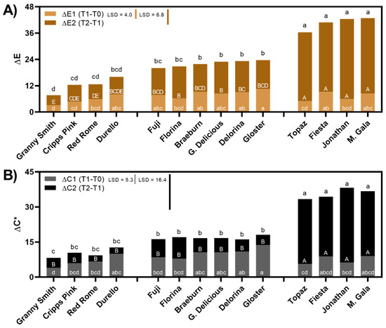Defined by CIE standards, L* (lightness), a* (red-green), and b* (yellow-blue) coordinates were captured to calculate color (E), along with the chroma (C*), which expresses the saturation (brighter or duller) of that color [36]. Both the color and chroma changes across time points (T0, T1, T2) are displayed by cultivar in Figure 1A,B. The total sum of color and chroma change from slice initiation to 24 h later (ΔE, ΔC*) is expressed as the total column for each cultivar (Figure 1A,B).