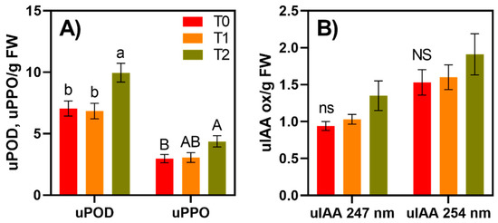 Change in enzymatic activity by time (T0 = immediately after apple cut, T1 = 1 h after cut, T2 = 24 h after cut): (A) = peroxidase units (uPOD) and polyphenol oxidase units (uPPO); (B) = indole-3-acetic acid oxidase units/g FW (uIAAox) over time. Means displayed are averages from all 14 cultivars. Means ± standard error displayed. Different letters above bars indicate differences according to Tukey post-hoc mean comparison at a p < 0.05. NS (non-significant difference) for IAA ox at either absorbance across time points. No significant interactions were detected by cultivar x time for enzymatic activities when assessed by ANOVA at p < 0.05.
