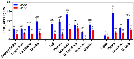Average enzyme activity for POD (uPOD) and PPO (uPPO). Means displayed are averages of all three times. Means ± standard error displayed. Different letters above bars indicate differences according to Student-Newman-Keuls (SNK) post-hoc mean comparison at a p < 0.05. No significant interactions were detected by cultivar x time for enzymatic activities when assessed by ANOVA at p < 0.05.
