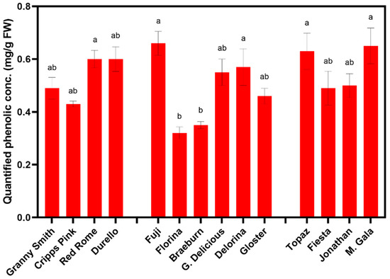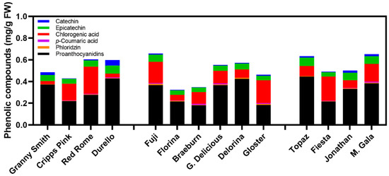 When assessing the composition of phenolic compounds in the apple varieties, HPLC analyses confirmed the presence of catechin, chlorogenic acid, epicatechin, p-coumaric acid, phloridzin, and proanthocyanidins (Table 1 and Table 2). These compounds’ presence is affirmed by previous literature [32,45] and contributes to apples’ antioxidant activity [53,54]. Quantified phenolic concentration (QPC) was determined by summing all the phenolic compounds detected (Table 1 and Table 2) and are displayed in Figure 4 (time points averaged).