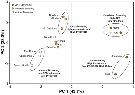 Principal component analysis (PCA) of apple cultivar characteristics such as color changes (i.e., browning), phenolic concentrations, and enzymatic activity. Large circles (scores) visualize the 14 cultivars, colored according to their browning severity (white = minimal, light brown = moderate, and dark brown = severe). PCA showcases that browning coloration and phenolic concentrations were a major contributor to variation amongst cultivars, with ~44% of the variation explained on PC1. An additional variation is explained along PC2 (28%) with enzymatic activity (PPO and POD) appearing to drive vertical separation amongst cultivars evaluated.