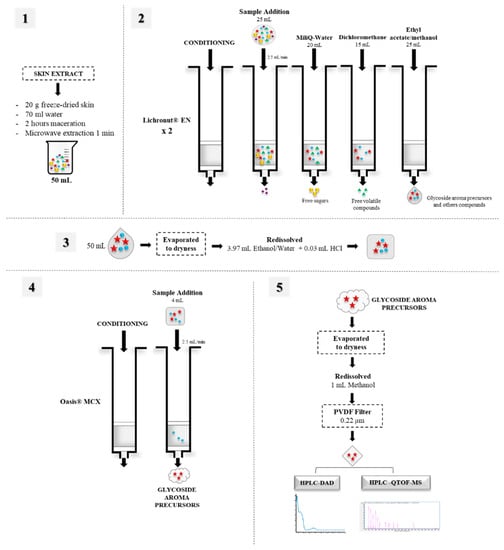 Glycosidic aroma precursors were extracted and purified using solid-phase extraction (SPE) according to the method described by Hernández-Orte et al. (2015) [], with minor modifications, as seen in Figure 1.